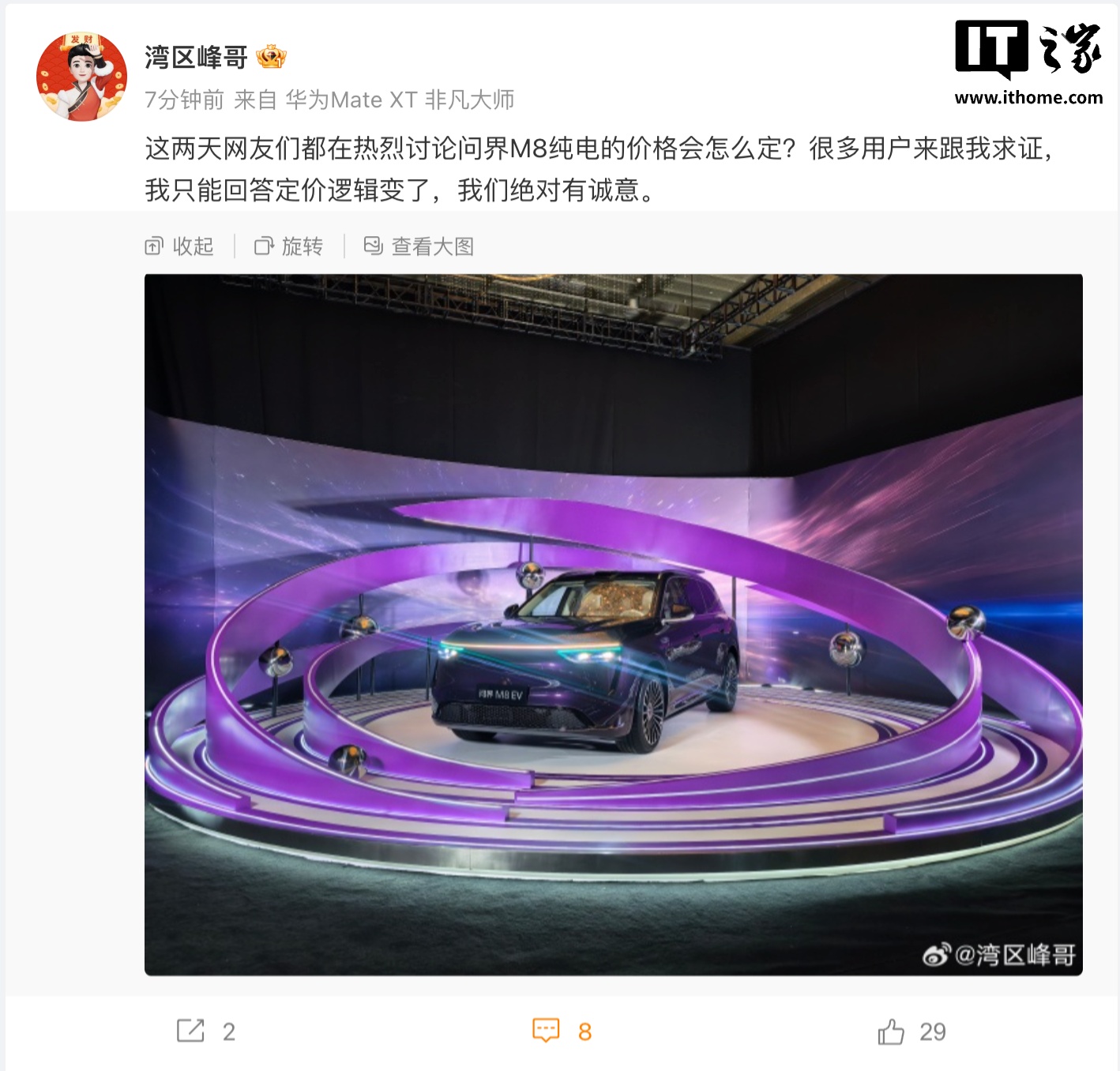 IT之家 8 月 15 日消息,鸿蒙智行问界 M8 产品经理 @湾区峰哥 今天中午在微博发文,透露了问界 M8 纯电版价格的部分信息:我只能回答定价逻辑变了,我们绝对有诚意。