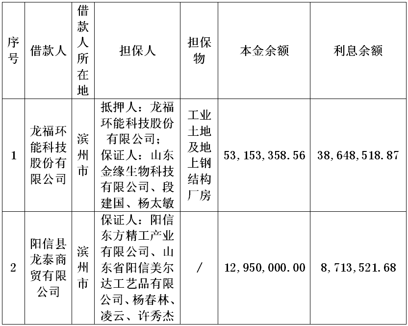 对龙福环能科技股份有限公司和阳信县龙泰商贸有限公司两户债务人所享有的债权及其附属担保权益,该债权及其附属担保权益的所有人为东方,截至2025年9月20日,该等债权项下未偿本息合计人民币11,346.54万元,其中未偿本金人民币6,610.34万元,未偿利息人民币4,736.20万元;分布在山东省滨州市。
